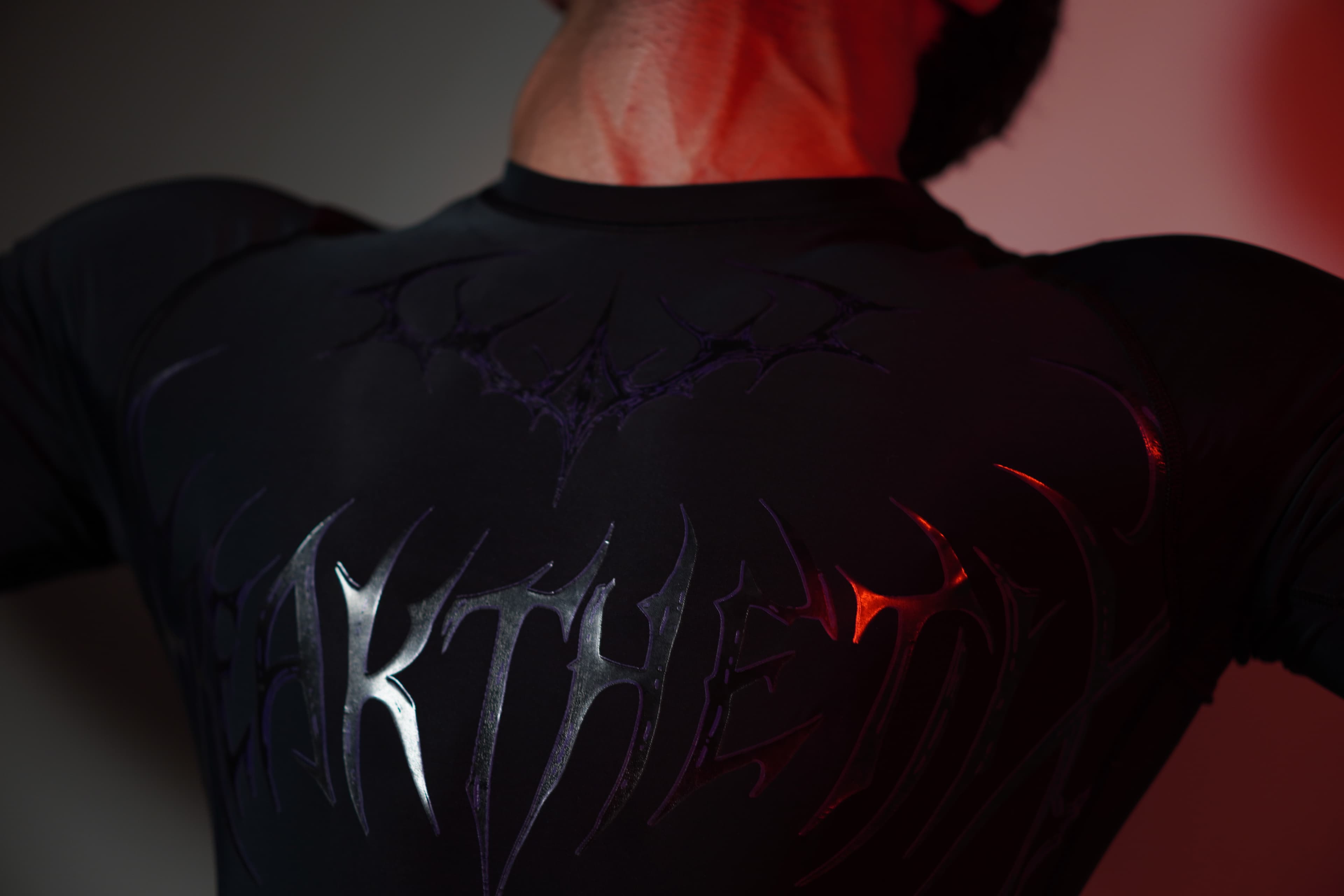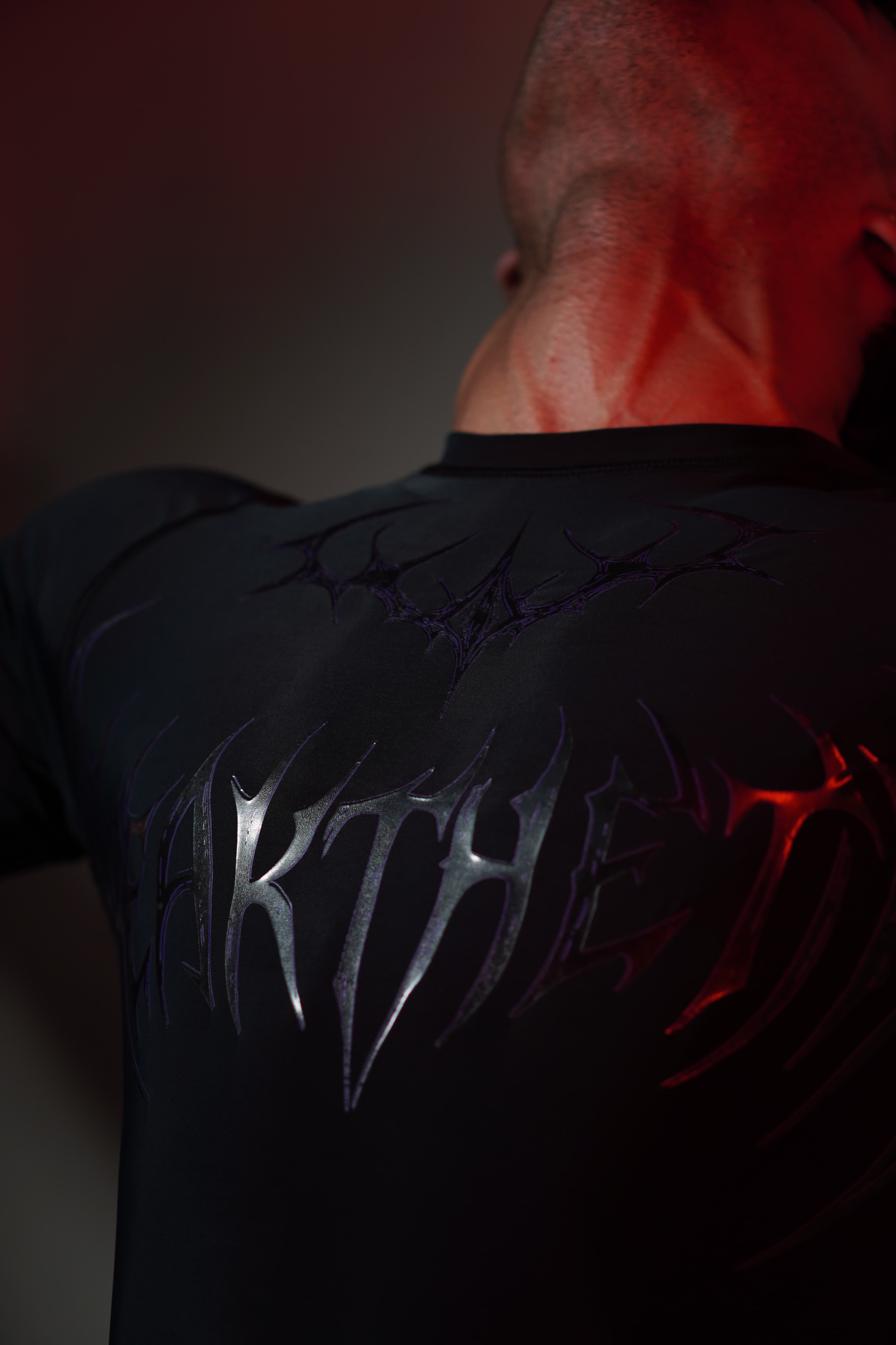 The entire chest is dominated by a massive, custom gothic logo, rendered in sharp, menacing lines. Above it sits a matching sigil, completing a look that's pure, unfiltered energy. This isn't just a logo; it's an armor plate.