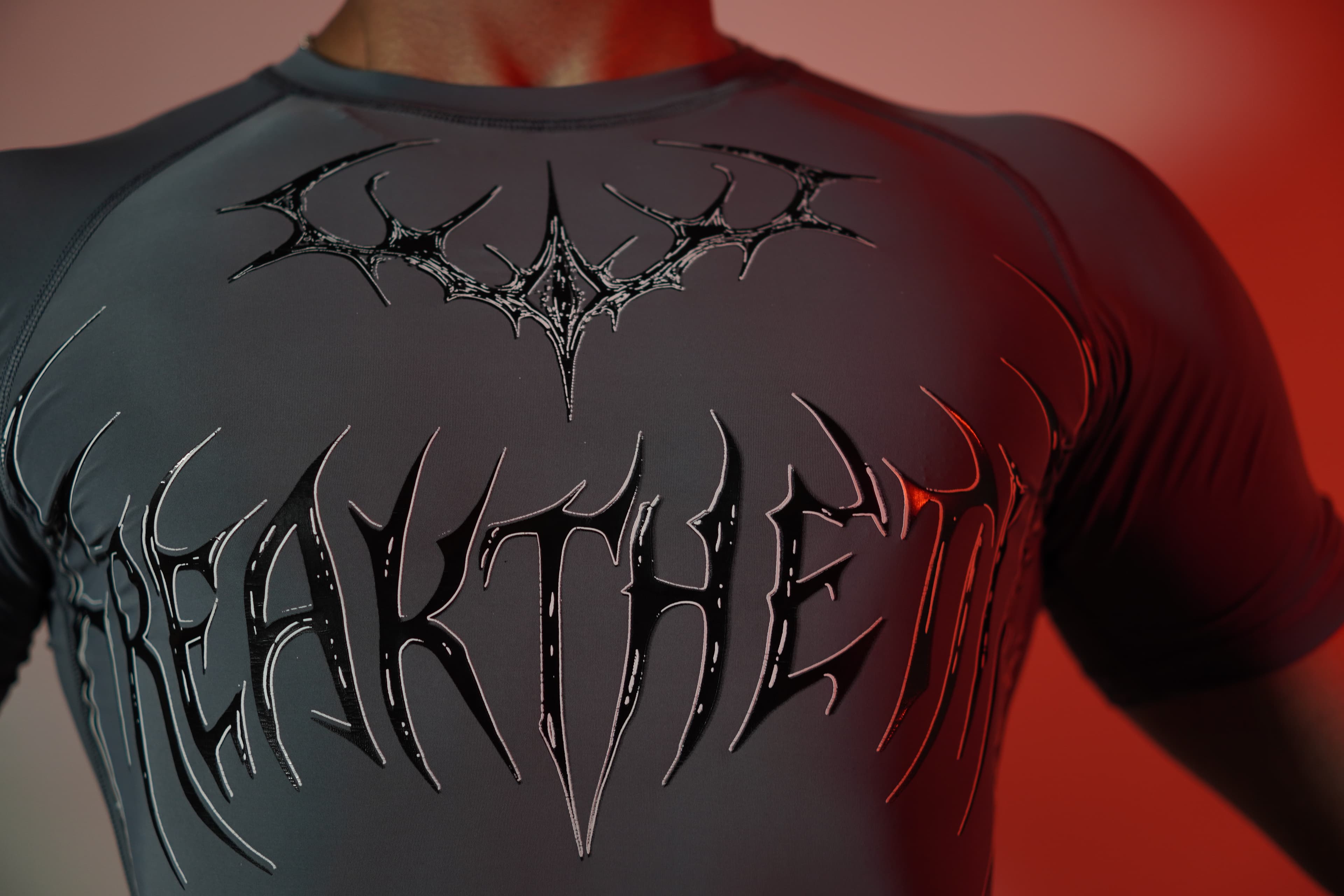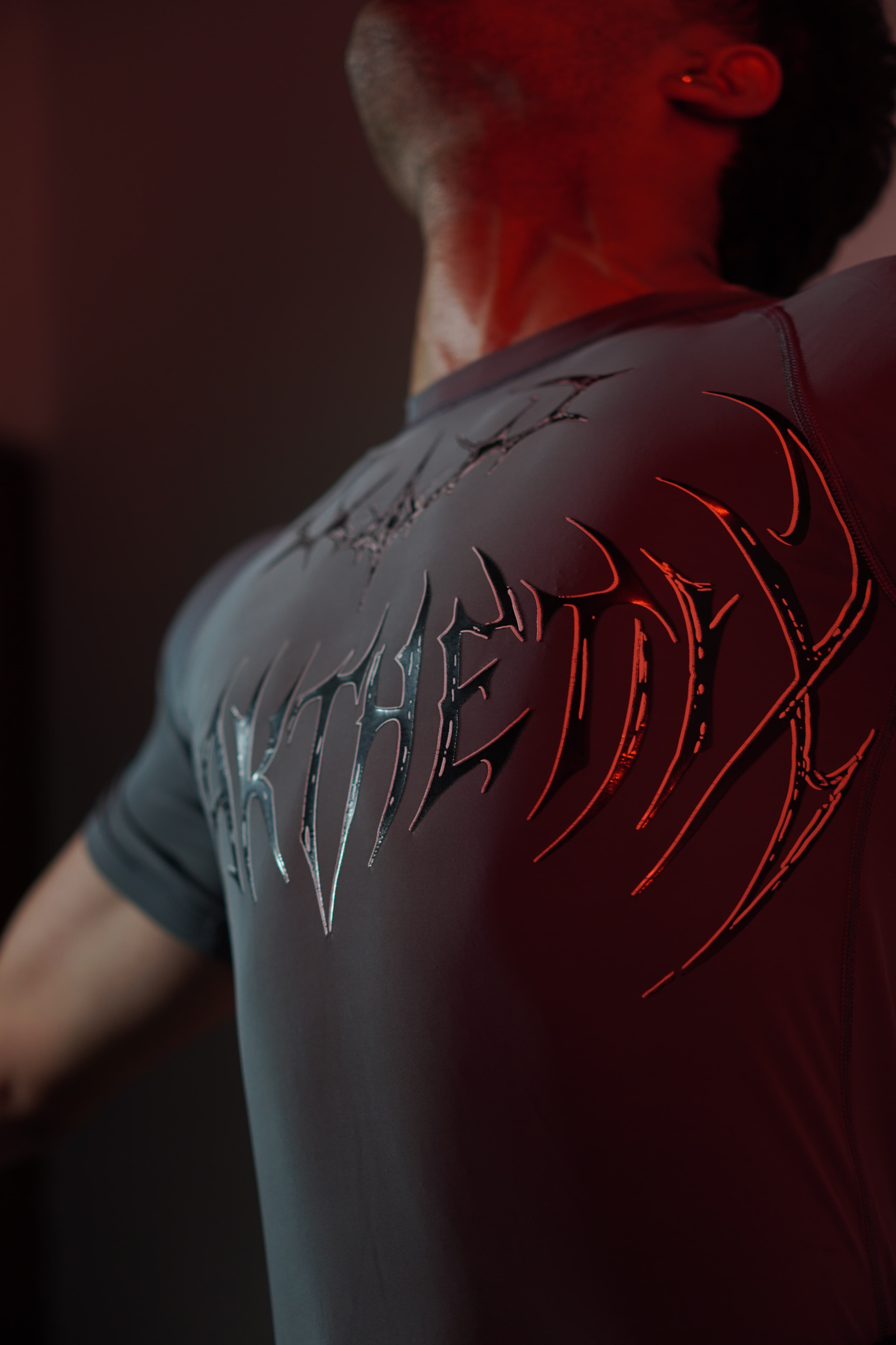 The entire chest is dominated by a massive, custom gothic logo, rendered in sharp, menacing lines. Above it sits a matching sigil, completing a look that's pure, unfiltered energy. This isn't just a logo; it's an armor plate.