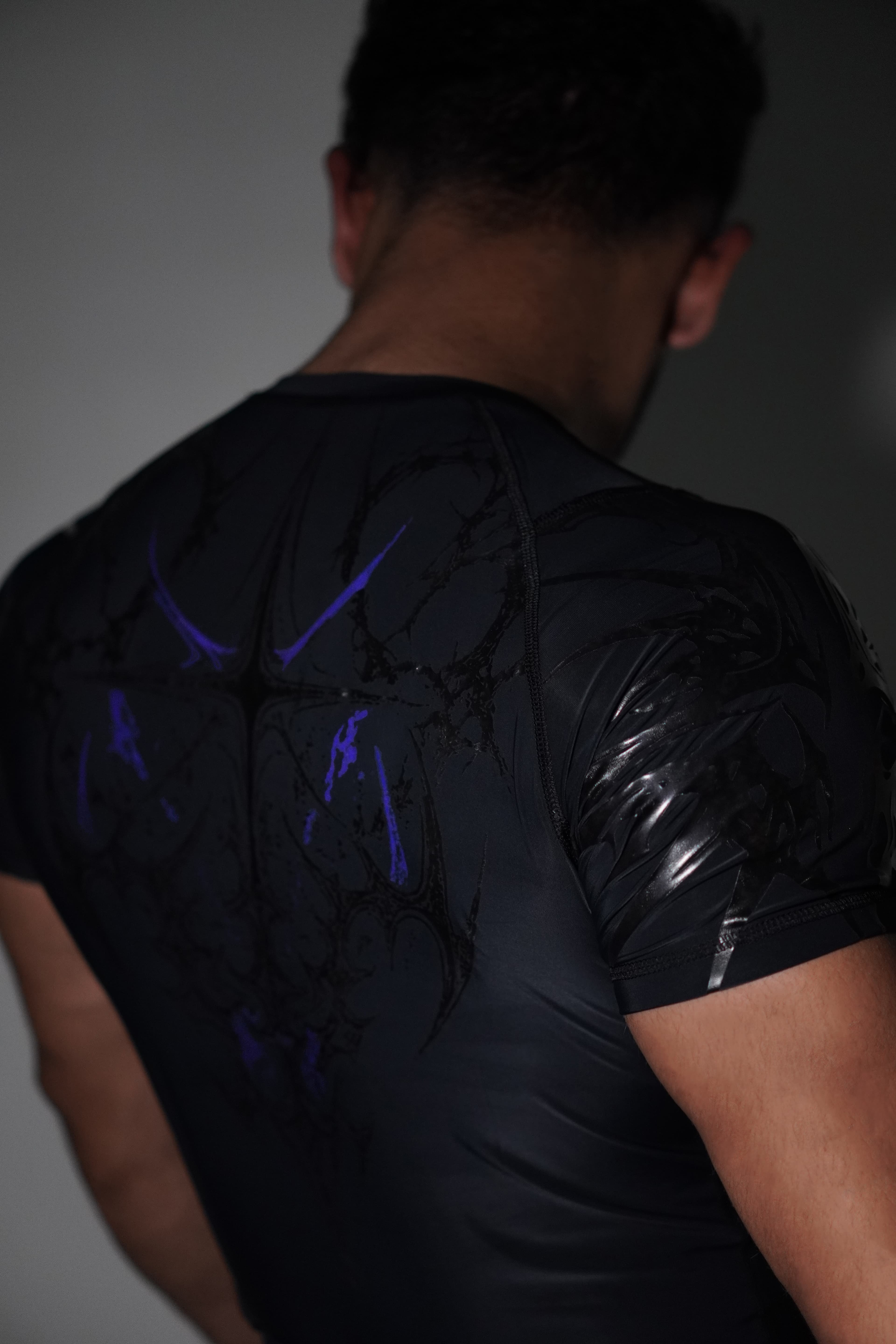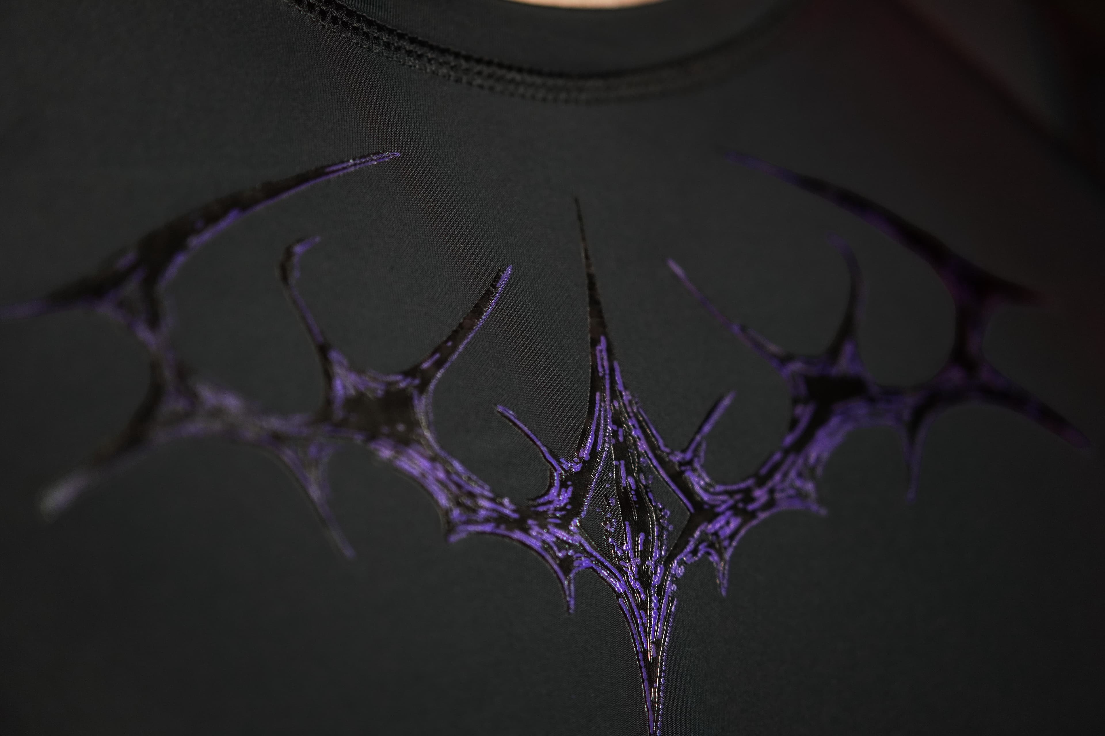 A dark, symbiotic print covers the chest, shoulders, and back, with deep purple "bleed" accents that seep through the black. The shoulders feature a distinct, high-gloss print, adding a unique texture that contrasts with the matte finish of the body.