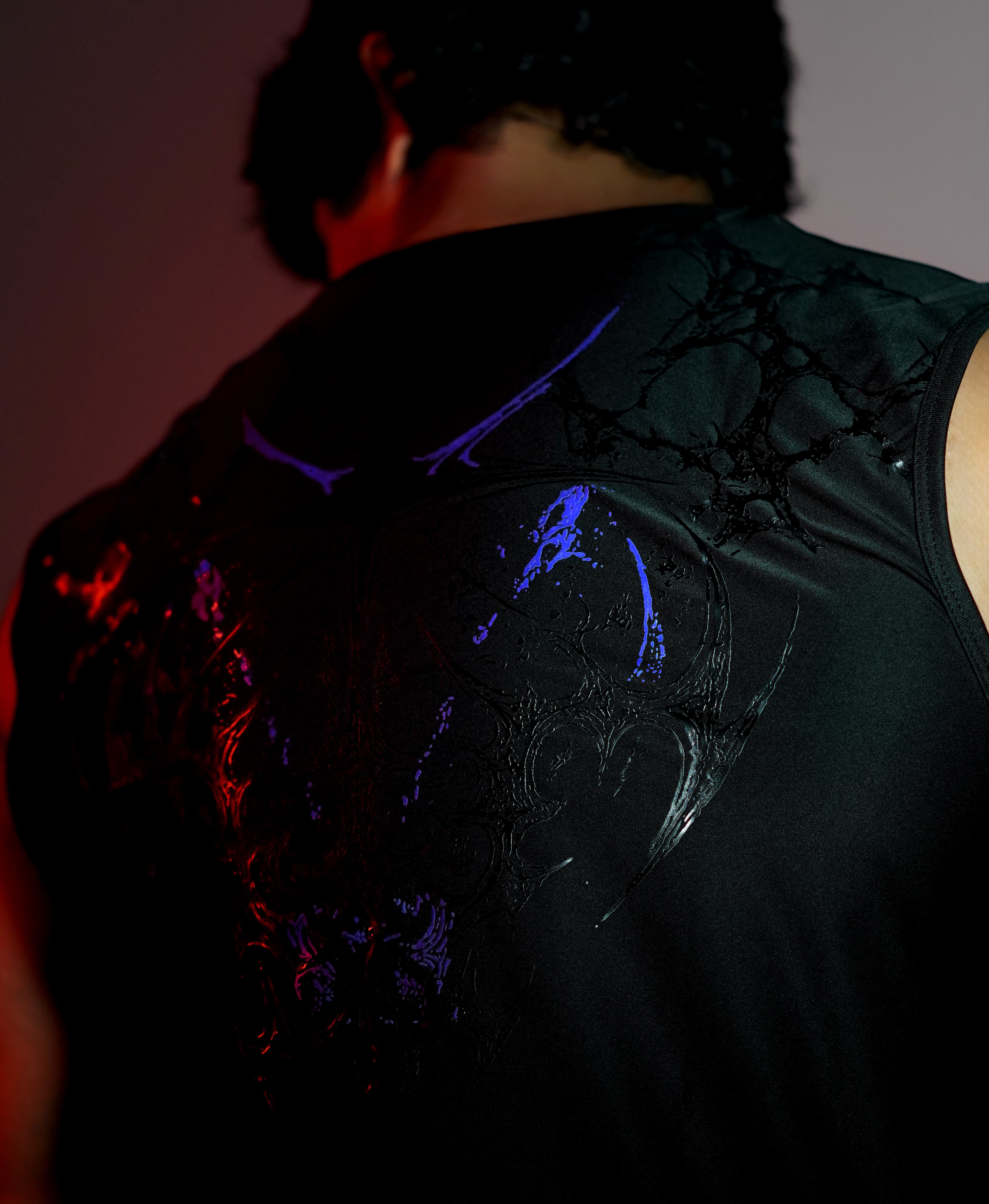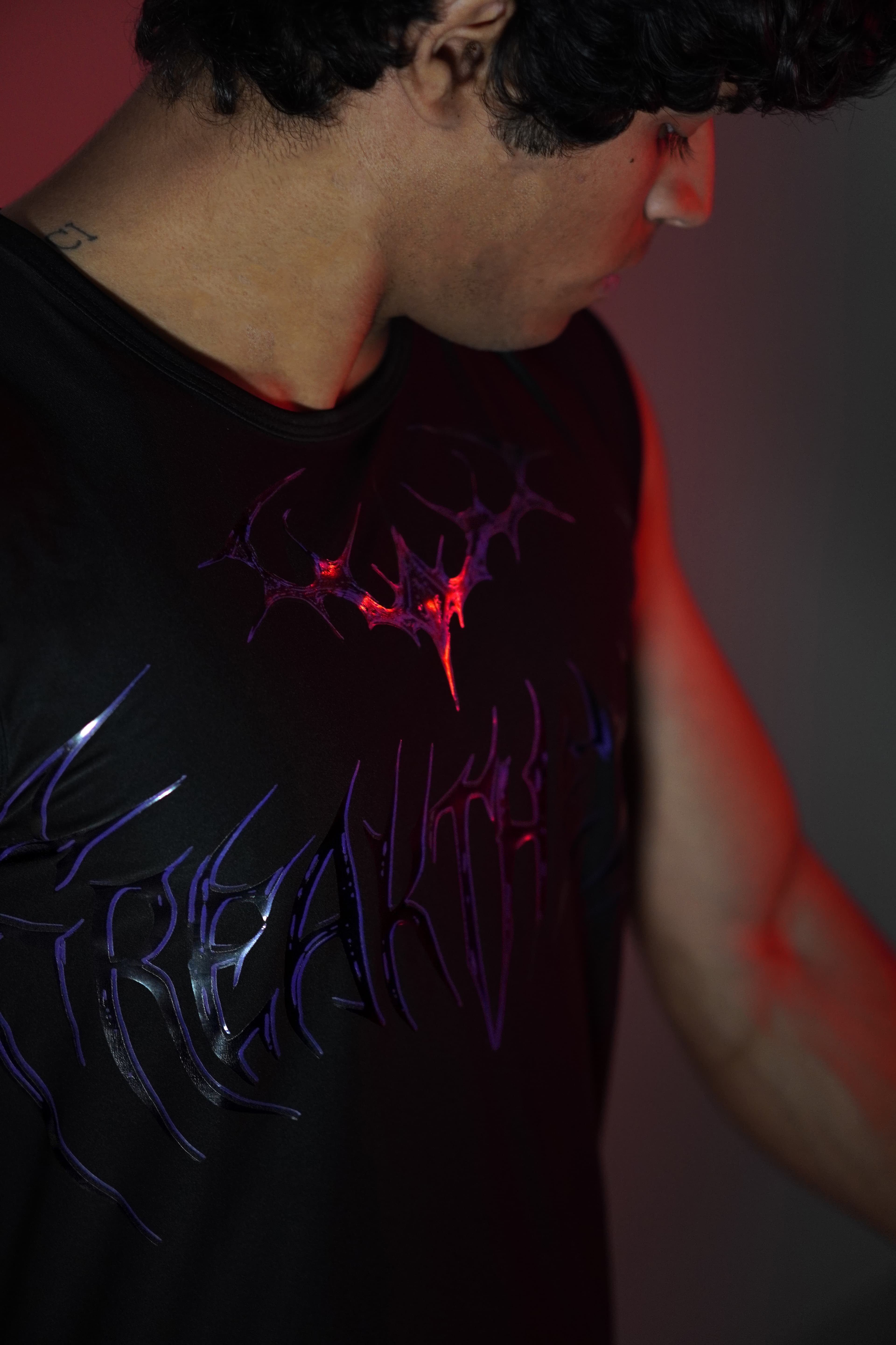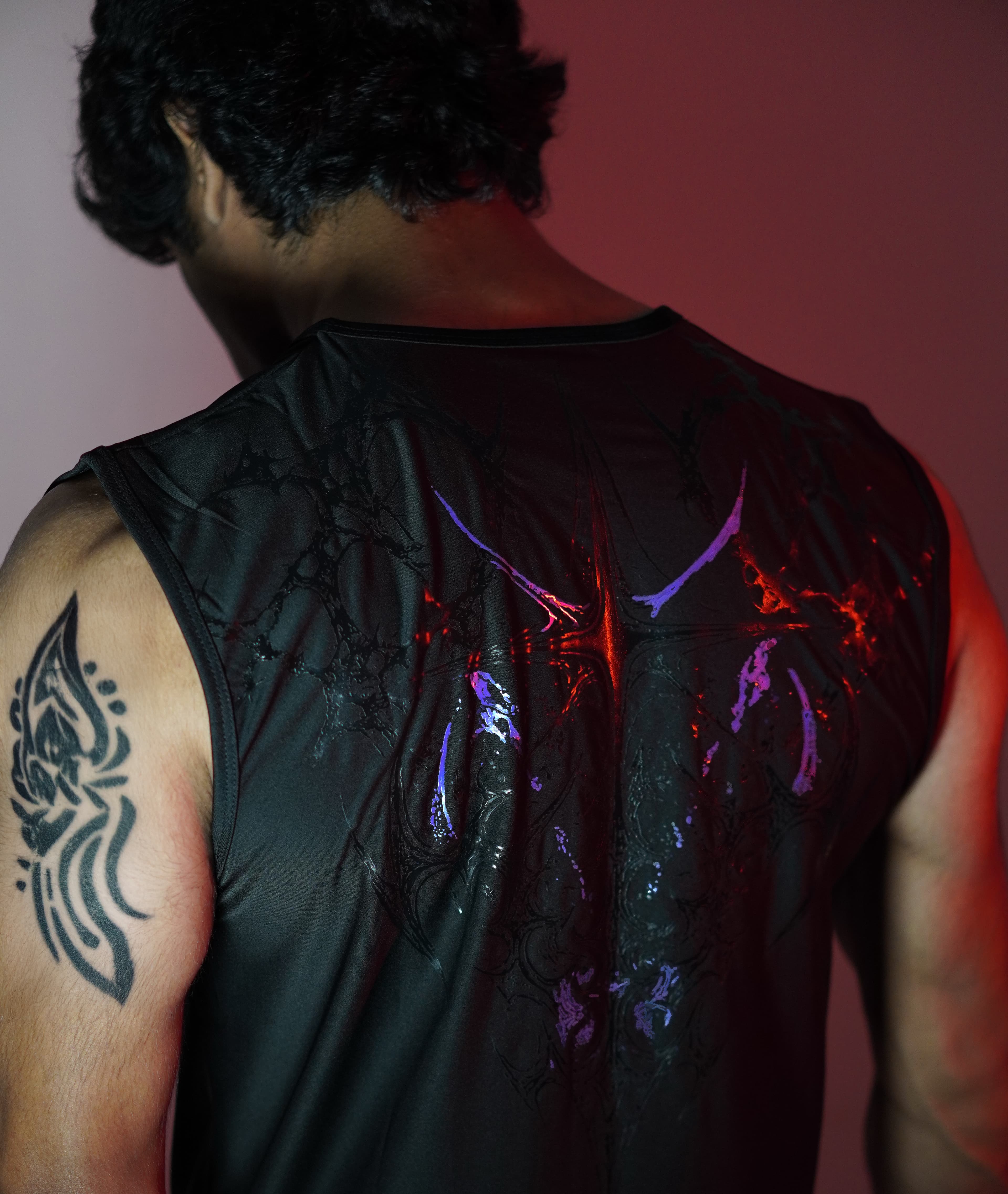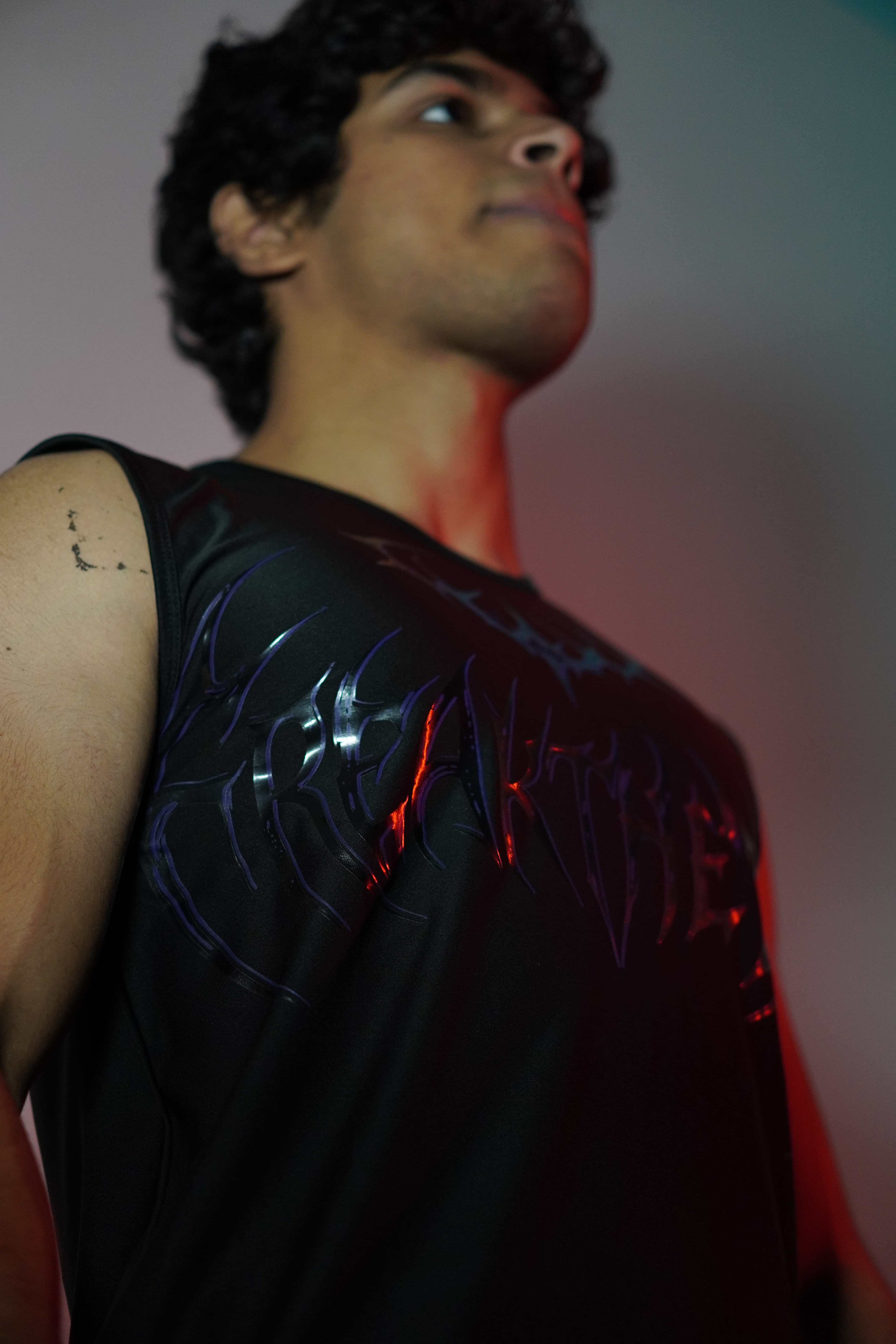 Built for those who need a full range of motion, this sleeveless compression shirt features the same dark, symbiotic print, with deep purple "bleed" accents that seep through the black. The design is printed on both the front and back, ensuring the look is complete from every angle.